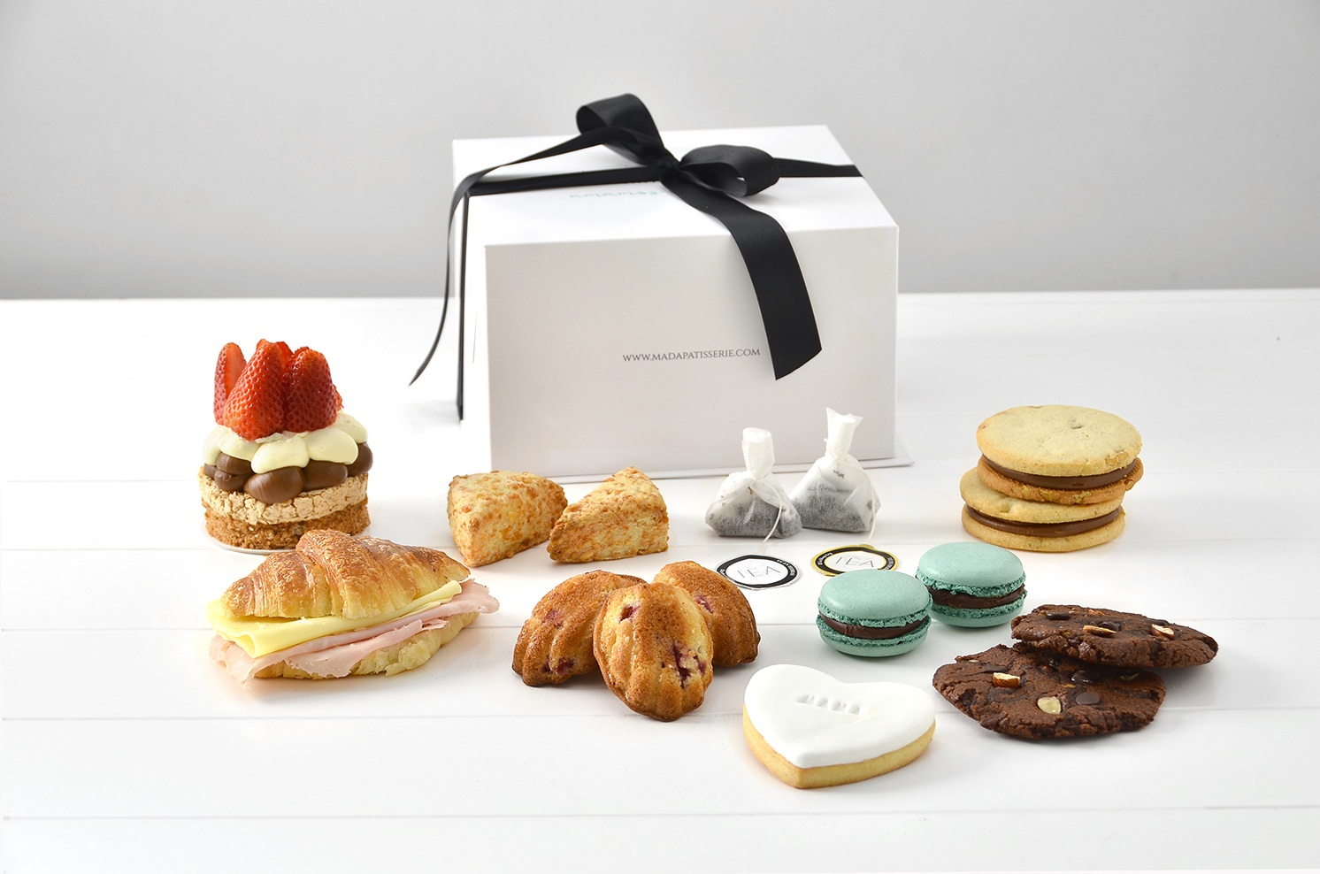 Inlcuye 2 Infusiones de té, 2 scons de parmesano, 1 croissant relleno de jamon y queso, 2 alfajores de nuez, 2 cookies de chocolate con avellanas, 2 macarons chocolate con praliné de pistacho, 3 madeleines con frambuesas, 1 cookie corazón “MAMÁ”y 1 mini cake especial: Dacquoise de nuez con frutillas o tarteleta de pastelera con frutillas. Consultar por otras opciones de mini cakes
